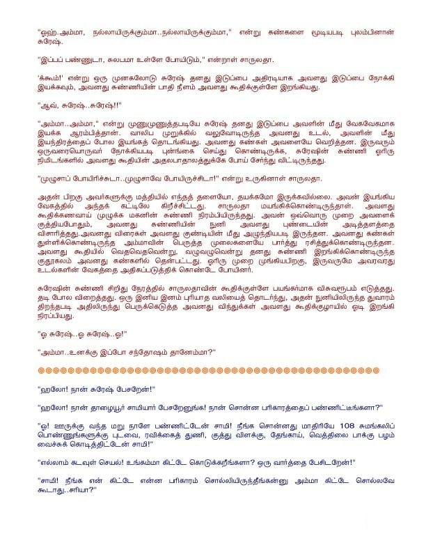 Tamil Hot Stories – அவன் பார்வை பதிந்திருந்த இடத்தில் அவன் அம்மாவும் தங்கையும் நின்றிருந்தார்கள். பத்மாவின் ஒரு கையில் திவ்யா அகப்பட்டிருக்க, அவளது இன்னொரு கையில் அடுப்பில் வைத்து எடுக்கப்பட்டிருந்த கரண்டி. அதை நீட்டி நீட்டி தன் மகளை மிரட்டிக் கொண்டிருந்தாள்.